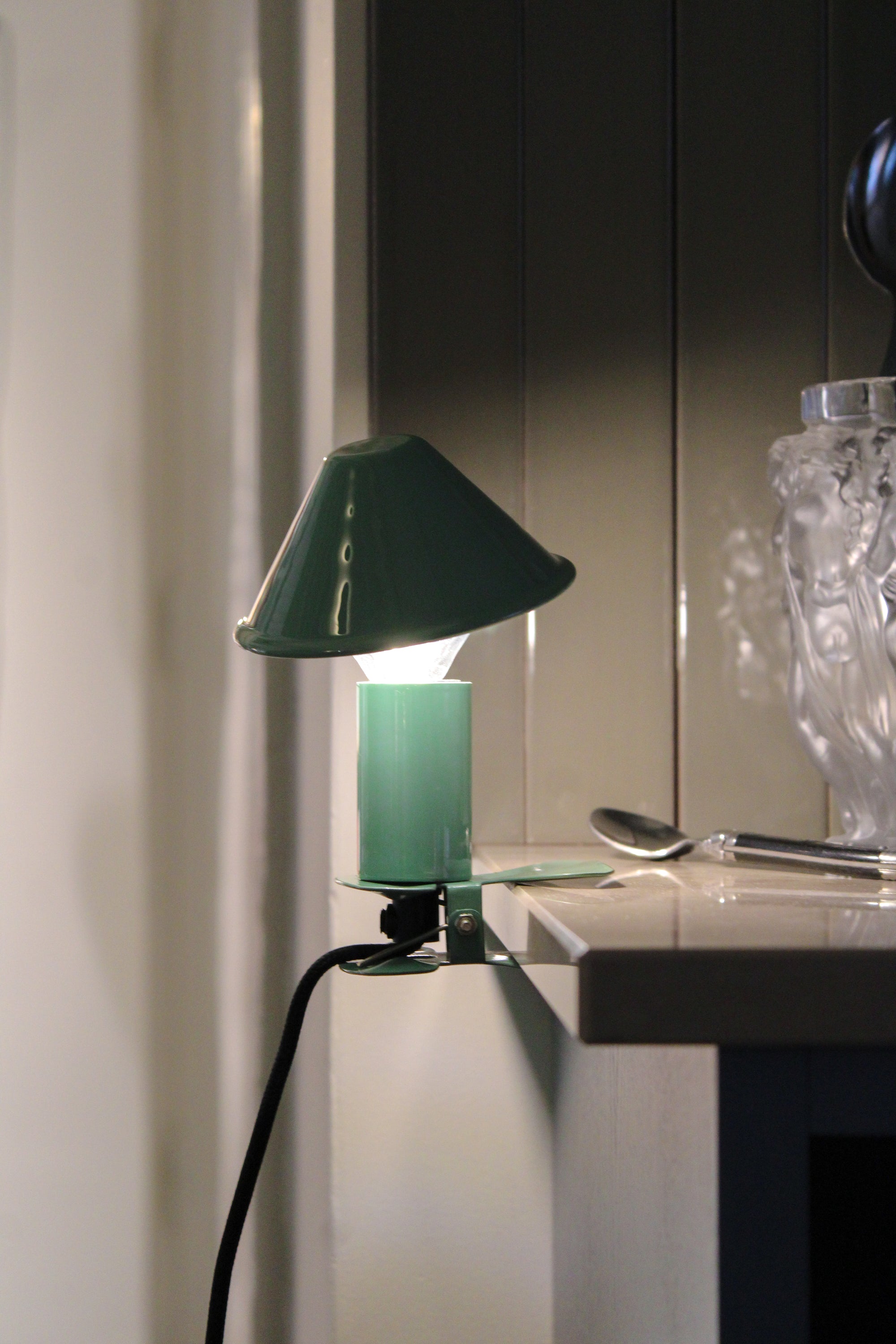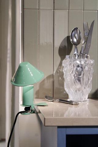 Lille klipslampe i industrielt design.