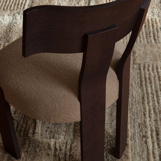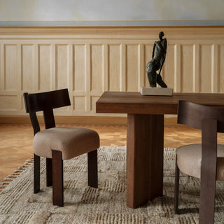 Alba-stolen i beige-lyserød har en robust, men elegant form. Den mørkbejdsede egsbase består af lige, kantede ben og en buet, generøs ryglæn. Det blødt formede sæde er betrukket med et boucléstof, der giver stolen ekstra komfort.