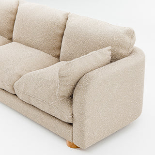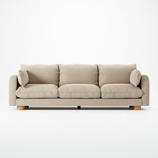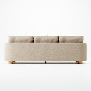 Miles Sofa Boucle Beige er en trepersoners sofa med en ramme lavet af massiv gran, krydsfiner og fyld af andedun, silikonekugler og skum. Sofaen er betrukket med et boucléstof fra Limonta. Udover denne trepersoners sofa indeholder Miles-serien også en lænestol og en loveseat.