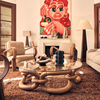 Bamboo Bracelet Sofa Table er et bord, der er kendetegnet ved sin iøjnefaldende base. Som navnet antyder, er det inspireret af et armbånd, der blev fundet på et loppemarked for flere år siden af designerne hos Dusty Deco.