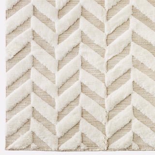 Herringbone Rug White er et håndvævet tæppe lavet af 100% uld. Tæppet har et tone-i-tone sildebensmønster i hvidt. Ved at kombinere fladvævet stof og shaggy luv skaber mønsteret en særlig høj og lav effekt.