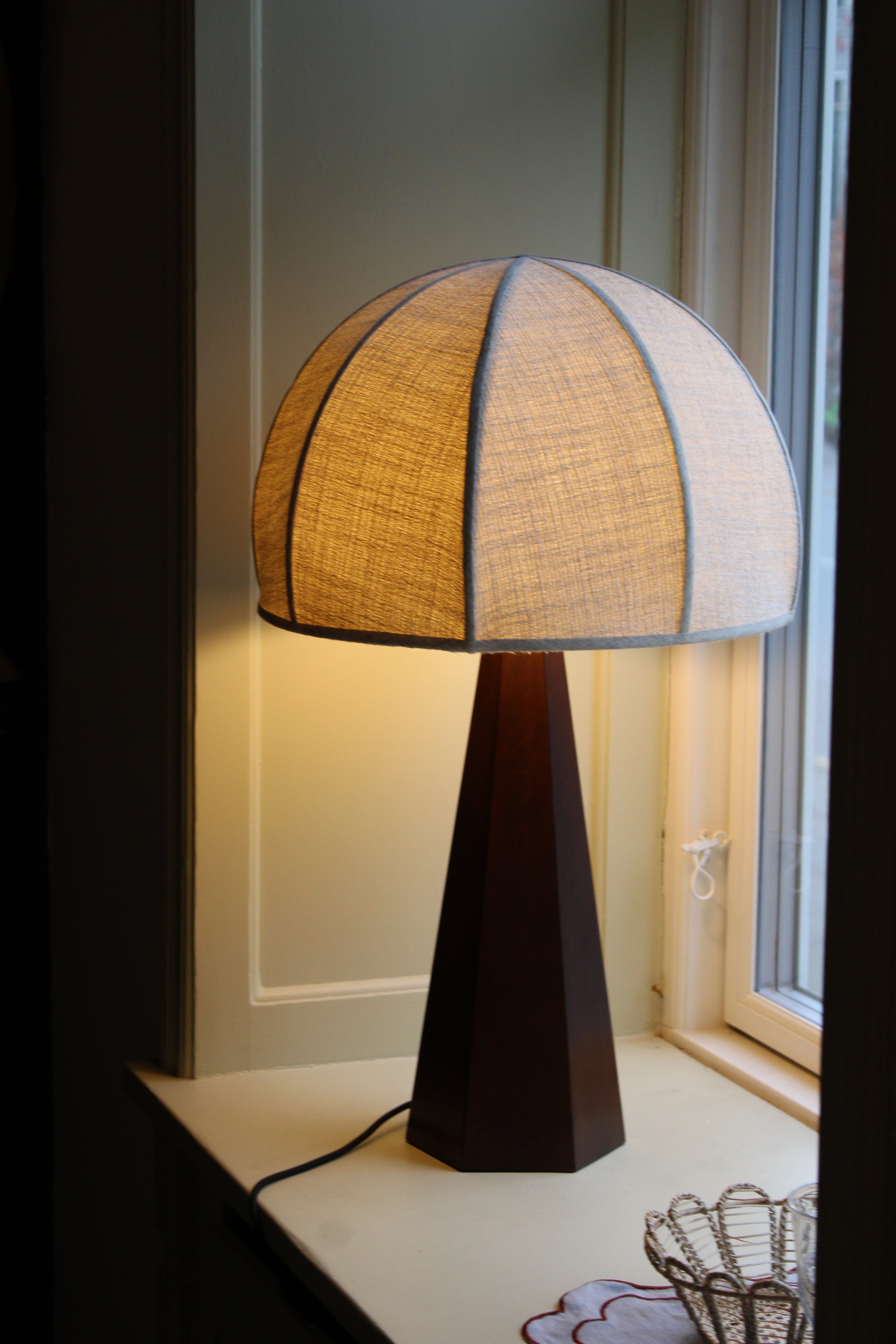 Hexagon-bordlampen har en mahognibase. En buet tekstilskærm sidder oven på træbasen. Hexagon-bordlampen passer lige så godt ind i stuen som i soveværelset. Uanset hvor du placerer den, vil den tilføje et strejf af 1970'er-stil til dit hjem. Sekskanten er en almindelig form i Dusty Decos designs, og vi elsker ideen om at style denne bordlampe med Hexagon-bordene i samme serie.