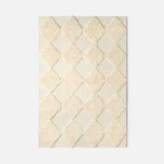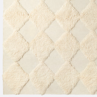 Chess Rya Rug White er et håndvævet tæppe lavet af 100% uld. Tæppet har et hvidt ternmønster, der går tone-i-tone. Ved at kombinere fladvævet stof og shaggy luv skaber mønsteret en særlig høj og lav effekt.