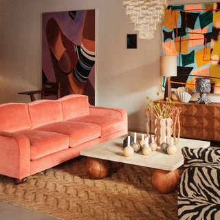 Sphere Square Sofa Table er et moderne sofabord med et design baseret på to geometriske figurer, kuglen og terningen. Den massive bordplade er lavet af en marmor kaldet travertin, som er en sten med en lys, hvid tone, hvor hver skifer er unik. Dette forstærker bordets karakter og gør hvert bord unikt. Bordpladen står i kontrast til de kugleformede fødder i massiv bøg. Fødderne er blevet bejdset og olieret for at give en mørk tone. Udover Sphere Square Sofa Table findes der også et lignende bord, men med en rund bordplade.