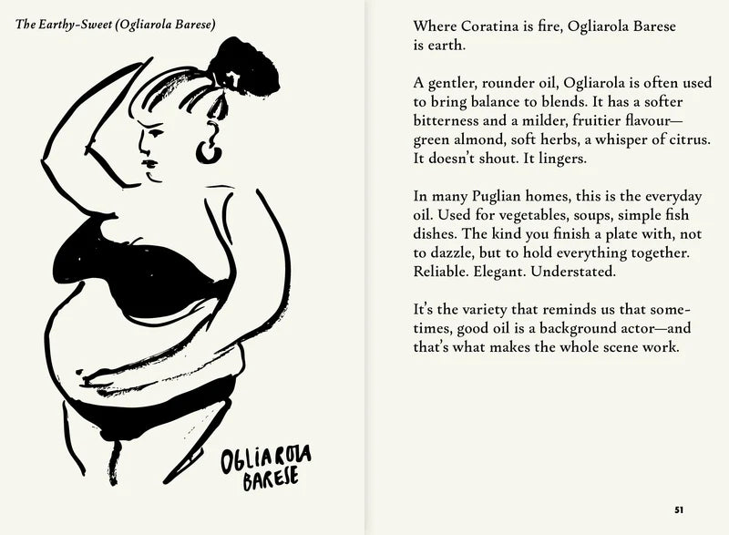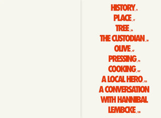 Indeni vil læserne opdage de gamle landskaber med oliventræer, møde de mennesker, der passer på dem, lære om regionens ikoniske olivensorter og følge hele rejsen fra frugt til levende grøn olie. Bogen indeholder også praktisk indsigt i madlavning med olivenolie og traditionelle opskrifter fra lokale hjemmekokke.