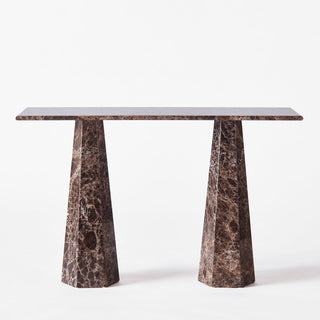 Hexagon-konsolbordet i mørk Emperador-marmor er et moderne konsolbord lavet af mørk emperador-marmor. En rektangulær bordplade hviler på to baser med en sekskantet form.