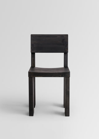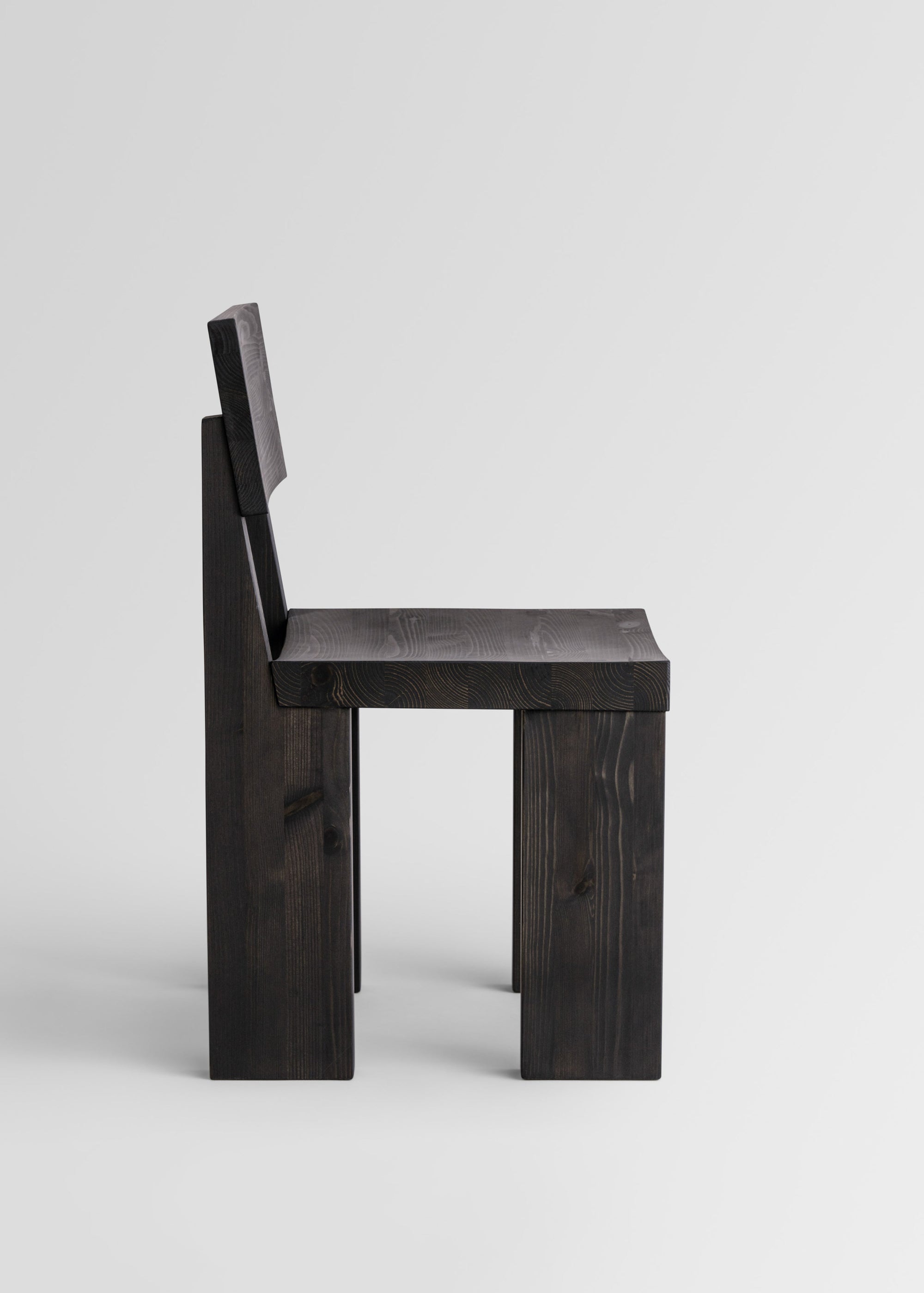 001 spisestuestolen i sort har en dyb sort bejdse, unik for Vaarnii, hvorigennem fyrretræets karakteristiske årestruktur forbliver behageligt synlig.