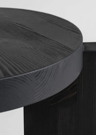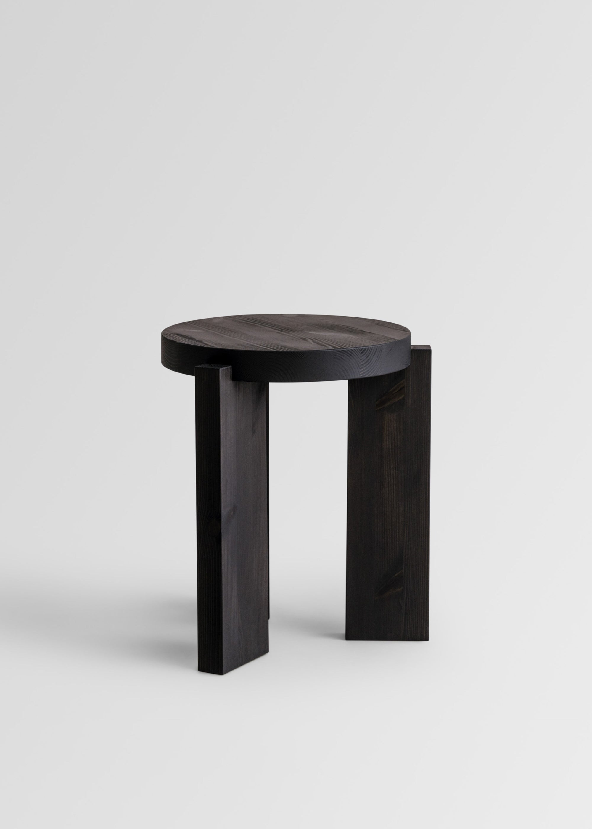 001-skamlen i sort har en dyb sort bejdse, unik for Vaarnii, hvorigennem fyrretræets karakteristiske åretegning forbliver behageligt synlig.