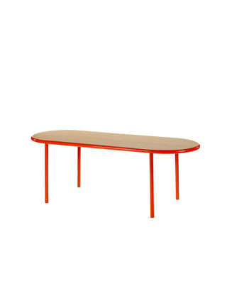 Wooden Table, fra Valerie Objects, designet af det belgiske designpar Muller van Severen. Bordet er minimalistisk og enestående i sit udtryk med det farvede stel og bordpladerne i forskellige materialer. Rammen og benene på bordet består af rundede stål tubes. Bordpladen i træ findes i fire forskellige trætyper; Birketræ, Egetræ, Valnød og Kirsebær.